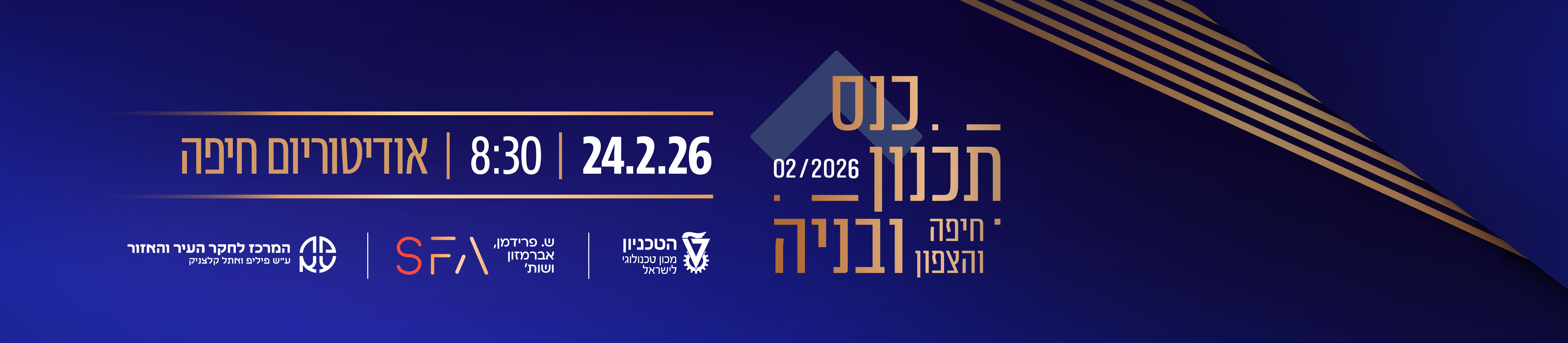 חיפה והצפון נמצאים בתהליך של תכנון, התחדשות ופיתוח, ואתם מוזמנים לשמוע על המהלכים שיעצבו את פני האזור בשנים הקרובות – ישירות מהאנשים שמובילים אותם. משרד ש. פרידמן, אברמזון ושות' עורכי דין, בשיתוף עם המרכז לחקר העיר והאזור בטכניון, מזמינים אתכם לכנס תכנון ובניה חיפה והצפון, מפגש הדגל של קהילת התכנון והבניה באזור, שירכז תחת קורת גג אחת נציגים מקרב מקבלי ההחלטות והגורמים המקצועיים במחוזות ובערים, אדריכלים, שמאים, חוקרים ונציגי חברות יזמיות מובילות. בכנס יוצגו תוכניות לפיתוח לצד דיון באתגרים ובהזדמנויות בתכנון ופיתוח המרחב העירוני, כדי שתוכלו לחדד כיווני פעולה, לזהות אפיקים חדשים ולחזק קשרים מקצועיים.