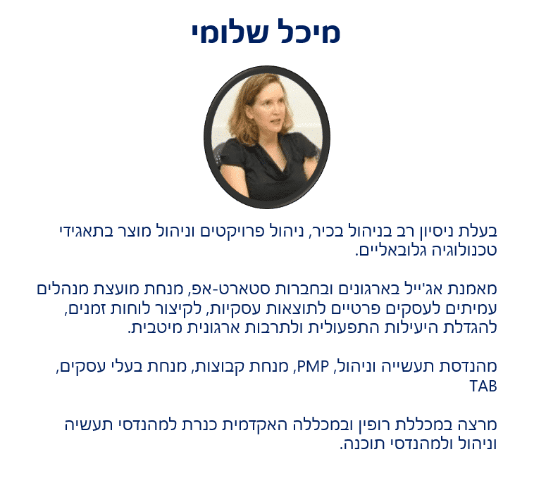 - למידה והתנסות של כלי משמעותי המלווה את התהליך ורלוונטי ליישום בתהליך ארגוני:
