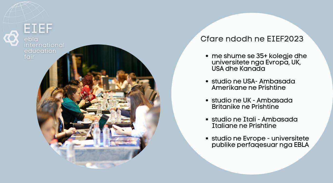 Panairi i Edukimit Jashte Vendit "EIEF Mars 2023" Data 19 mars 2023 | Ora 14:00| Hotel Sirus| Prishtina, Kosove Për më shumë informacione, kontaktoni Organizatorin e EIEF 2023: Educational Business Links Albania |