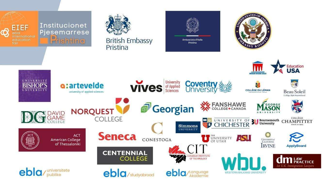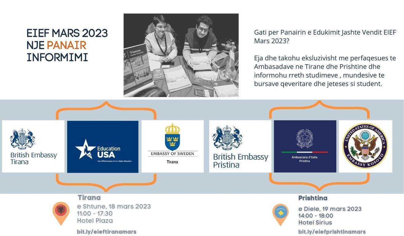Ekskluzivisht perfaqesuesit e Ambasades Amerikane, Ambasades Britanike dhe Ambasades e Italiane ne Kosove do t’i bashkohen panairit te edukimit EIEF Mars 2023 dhe do te flasin gjithcka doni te dini rreth USA, UK dhe Italise ne lidhje me studimet, bursat e meritokracise, vizave studentore dhe pyetjeve te tjera.
