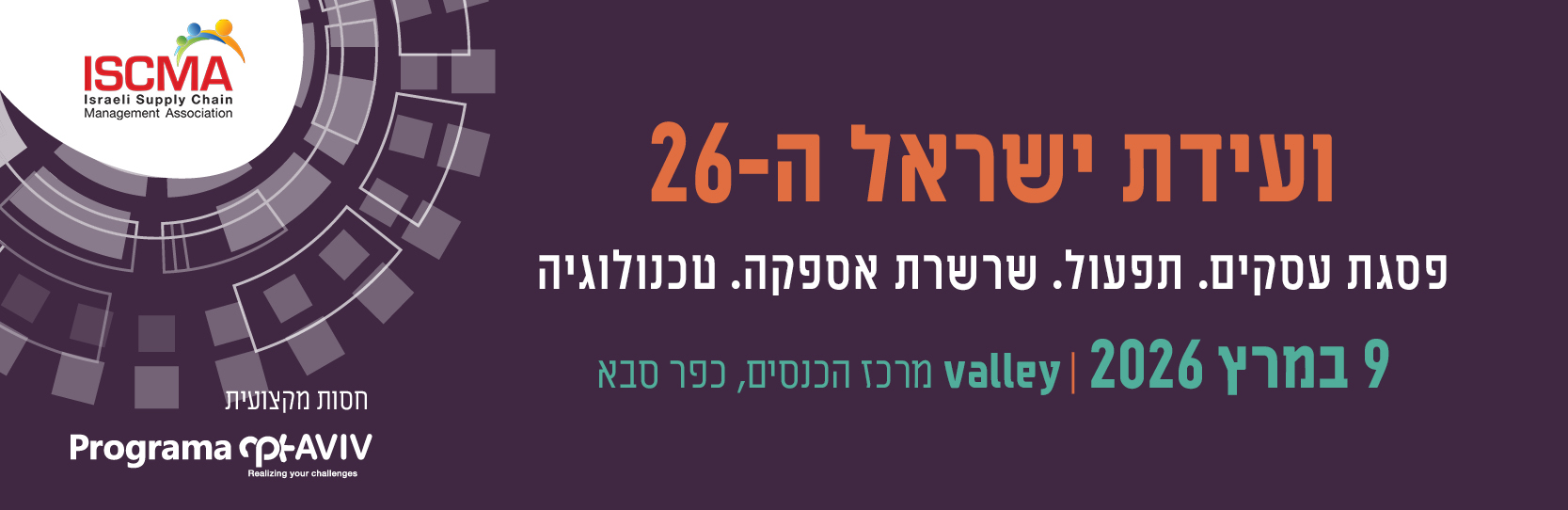 הפתרון: ועידת ישראל ה-26 לניהול שרשרת האספקה, הכנס השנתי של האיגוד הישראלי לניהול שרשרת האספקה ISCMA, מזמינה אתכם לחוויה מעשירה שתקנה לכם כלים מעשיים להתמודדות עם האתגרים ולמינוף ההזדמנויות.